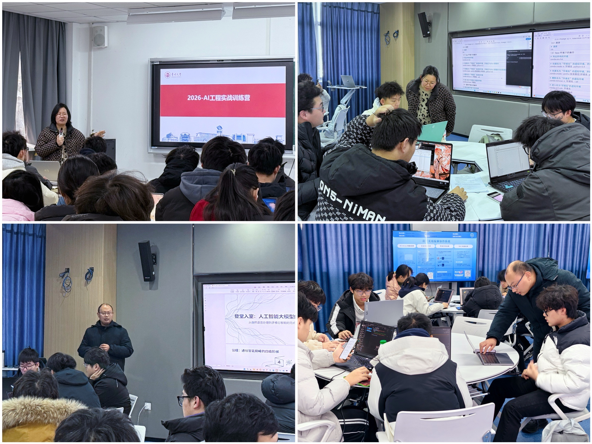 AI工程实战训练营则紧密对接人工智能发展趋势,围绕机器学习、大语言模型与AIGC技术应用等模块展开教学与实践。在跨学科导师指导下,学生系统学习技术方法,完成环境配置、数据分析与模型训练等基础实践,并通过跨年级组队方式围绕音乐生成、健康饮食、智能穿搭等具体场景,开展大模型应用的项目设计。训练营贯彻“学练结合、以赛促学”的理念,通过案例学习、小组协作与项目答辩,引导学生在实践中理解人工智能技术脉络,完成了从场景分析、技术选型到方案展示的全过程体验,为后续深入专业学习和参加竞赛积累了宝贵经验。