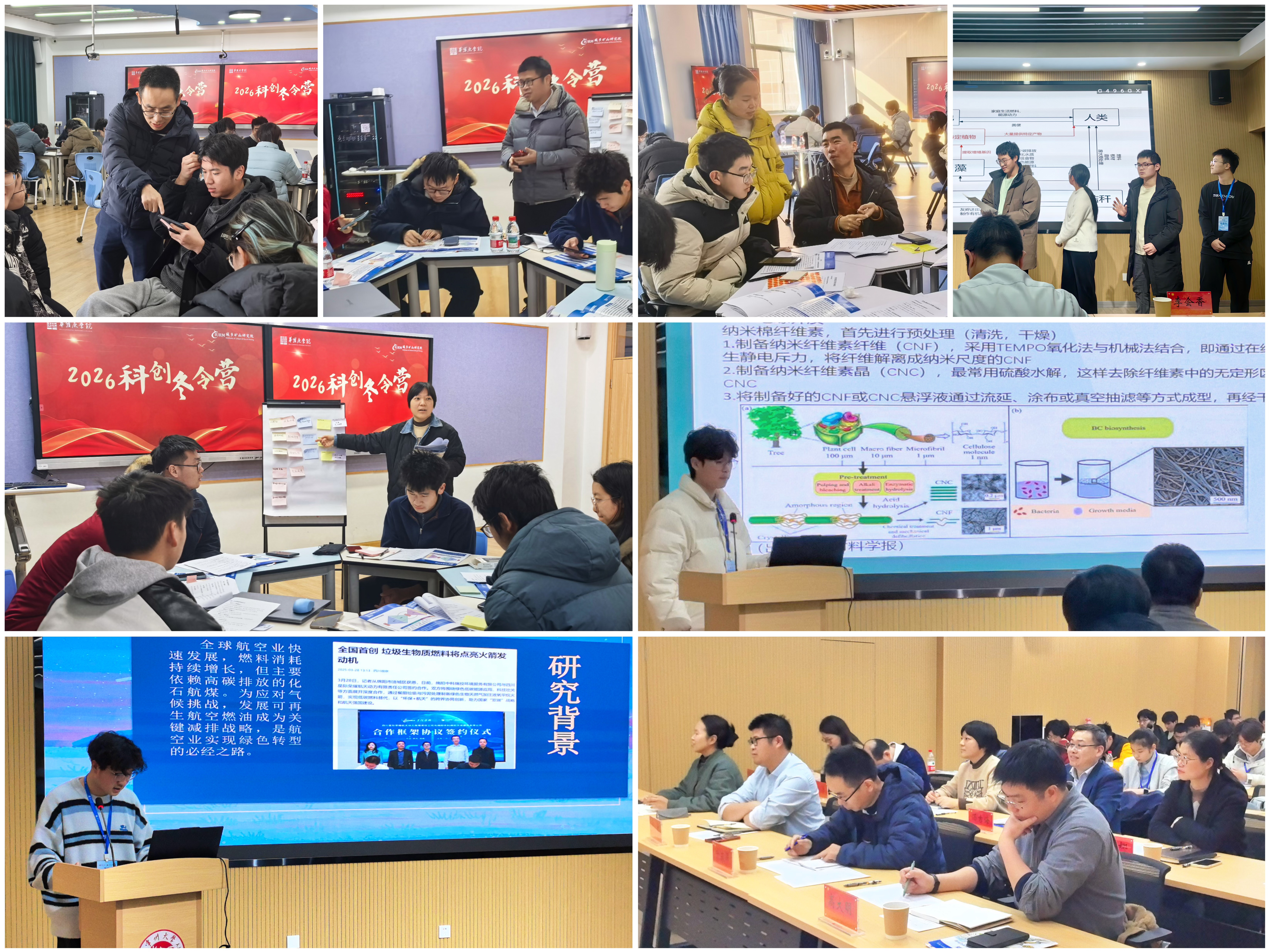 作为本次冬令营的核心板块之一,“碳”索新路训练营在城乡矿山研究院大力支持下,成为“学院-研究院协同育人”机制的重要实践。该板块紧扣“双碳”目标,聚焦生物炼制、循环经济等国家战略领域,通过主旨报告、专题沙龙及综合实验等形式,引导学生深入理解生物质资源转化的技术路径与高值化应用场景。在设计思维工作坊与创新设计大赛中,同学们跨校组队、互相启发,围绕废弃塑料分级热解制氢、农林废弃物制备淀粉、藻类生物质高值转化、基于纤维素的超级电容器开发等8个方向开展方案设计与探究,在模拟真实科研流程中提升了解决复杂工程问题的能力。